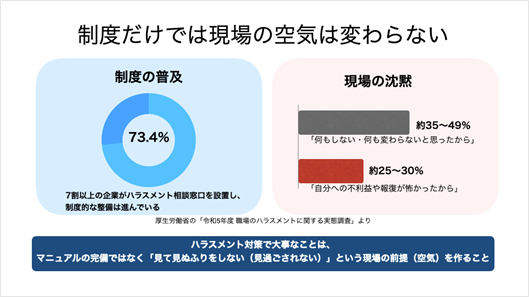 ここから見えてくるのは、ハラスメント対策の本質が「制度」ではなく現場の空気にあるという実態です。
